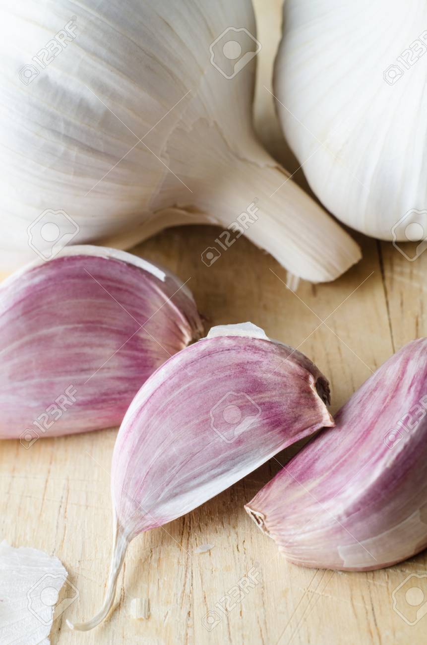 高架 全体 皮が付いたままのニンニクの球根と散乱 Papery 皮傷木製のまな板と 3 つのピンク クローブのビューを閉じる の写真素材 画像素材 Image